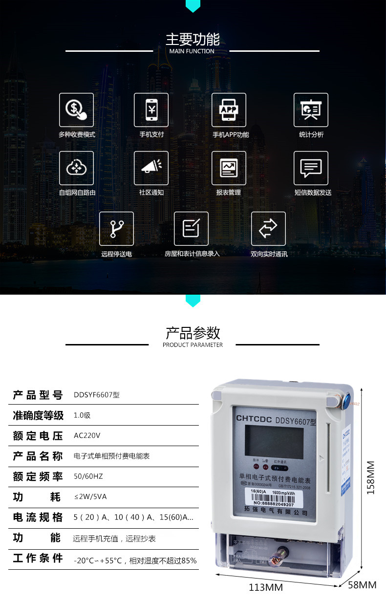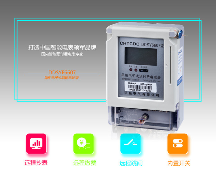 產品符合GB/T17215.321-2008《1級和2級靜止式交流有功電能表》和GB/T 18460.3-2001 《IC卡預付費售電系統第3部分:預付費電能表》的全部技術要求。本儀表符合GB/T 17215.321-2008和 485通訊 DL/T 645-1997/2007標準。具有485跟紅外通訊,遠程拉合閘斷電送電,遠程充值,遠程抄表,無需連線,電表安裝好連接wifi即可遠程控制。