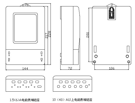 5.2電表上部有掛鉤螺釘孔,用M4掛鉤螺釘固定,電表下部有2個安裝孔用M4X10或M4X12普通螺釘固定在接線板上。電能表的安裝、尺寸如圖下: