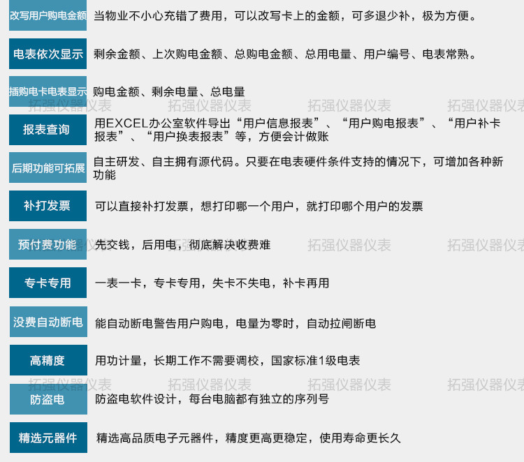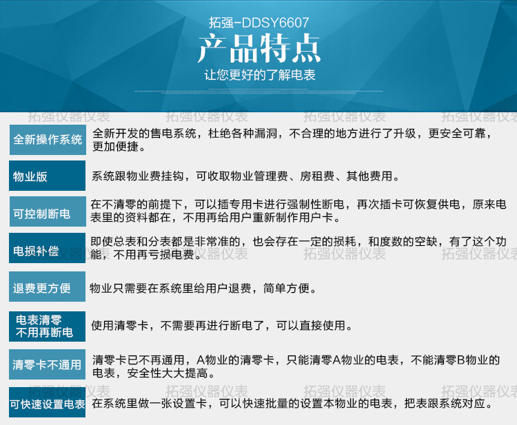 主要特點:應用計算機管理,先購電后用電;在額定電流范圍內能限制最大使用功率(由供電部門限定);一表一卡,專卡專用,失卡不失電,補卡再用;電卡能雙向傳遞數據,能自動斷電告警用戶購電;電量為零時,自動拉閘斷電;并具有一定的防竊電軟件設計等。