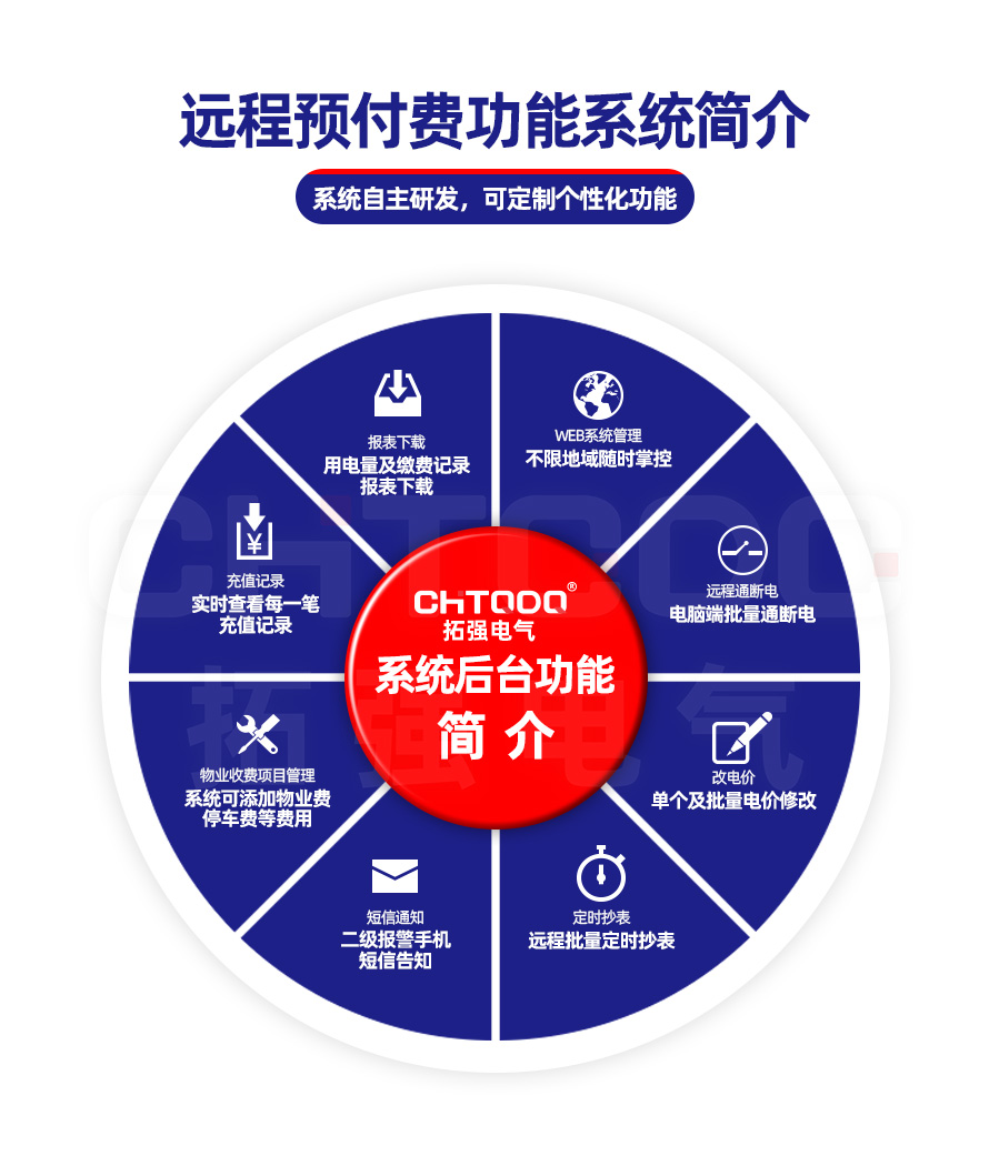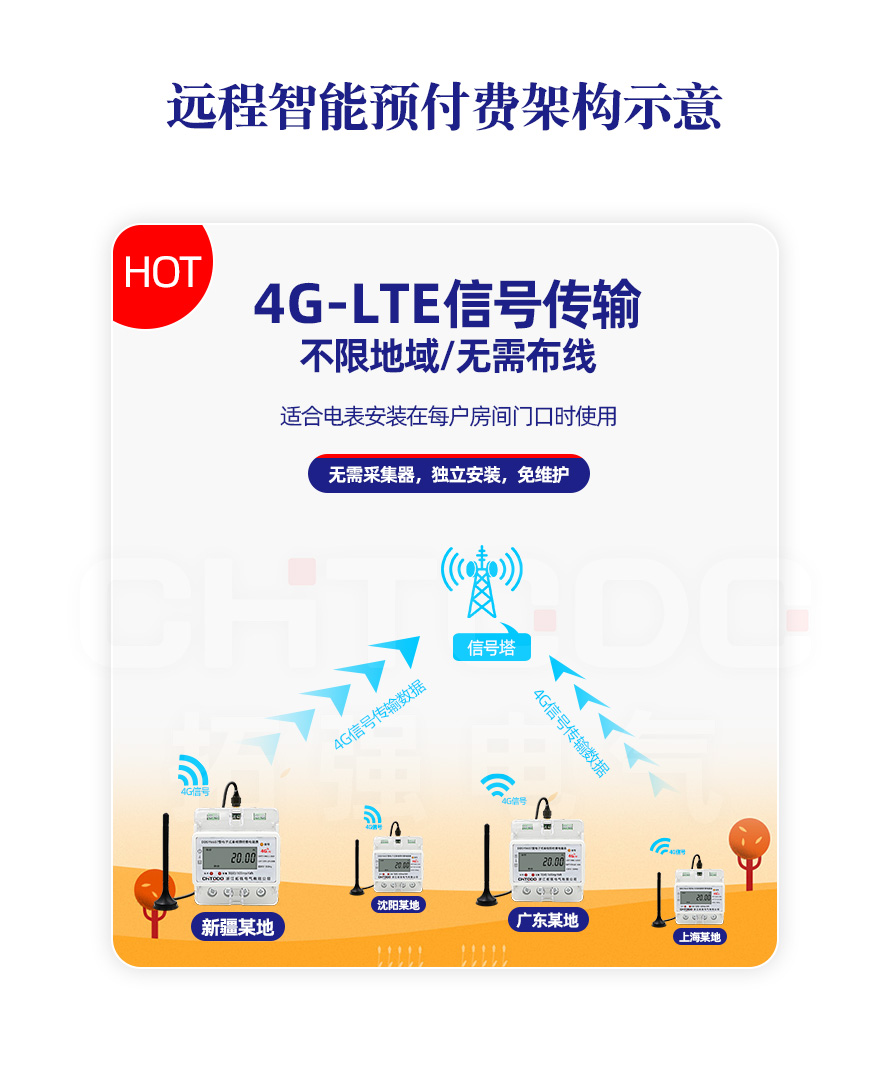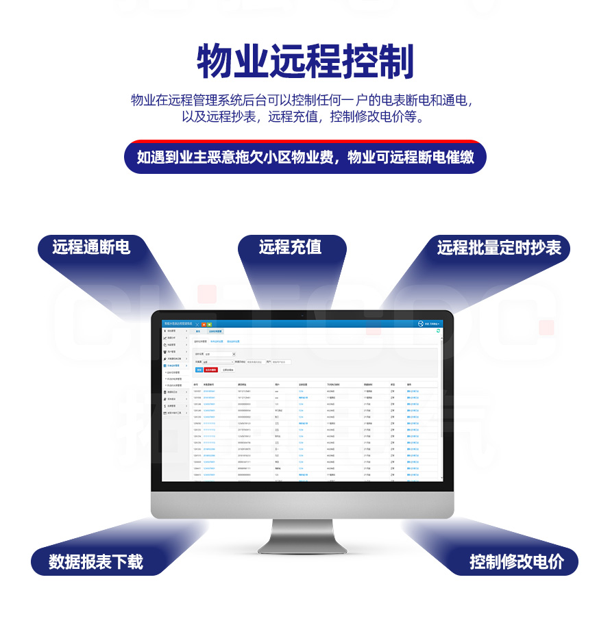 電表可與本公司遠程抄表系統和手機APP配套使用,遠程抄表管理系統具有實時抄表、定時抄表外,還提供了設備管理功能,如告警、余額短信通知、遠程充值、手機抄表、手機查詢、手機充值、預付費、后付費、自助充值機充值、遠程拉合閘、各種查詢報表、統計報表下載等功能。