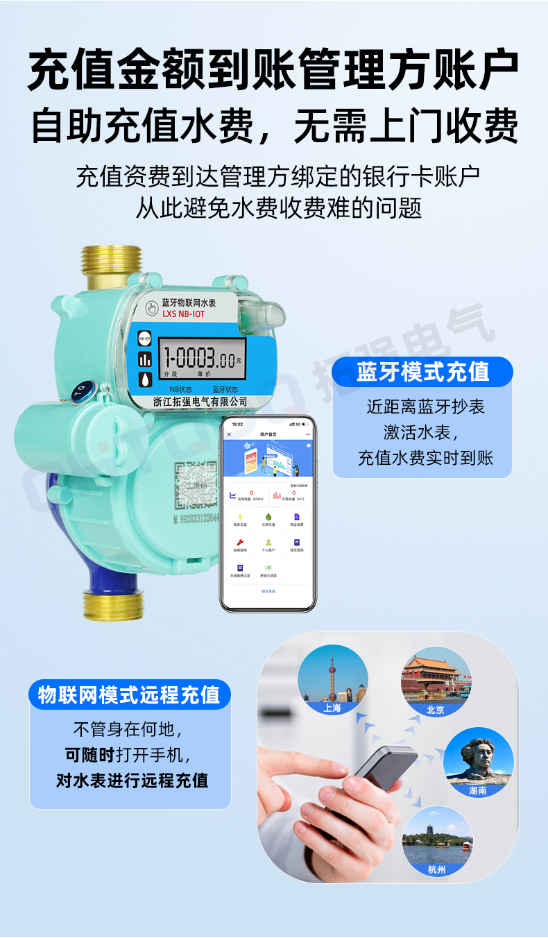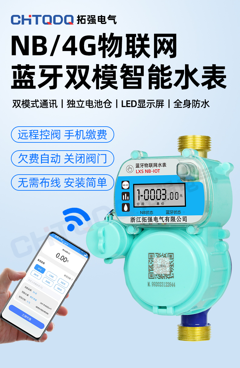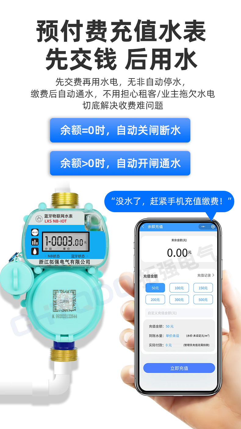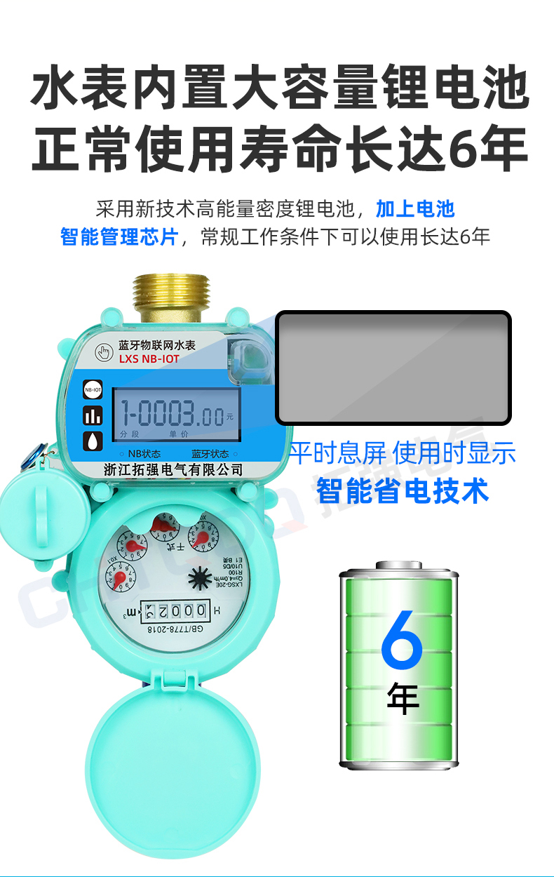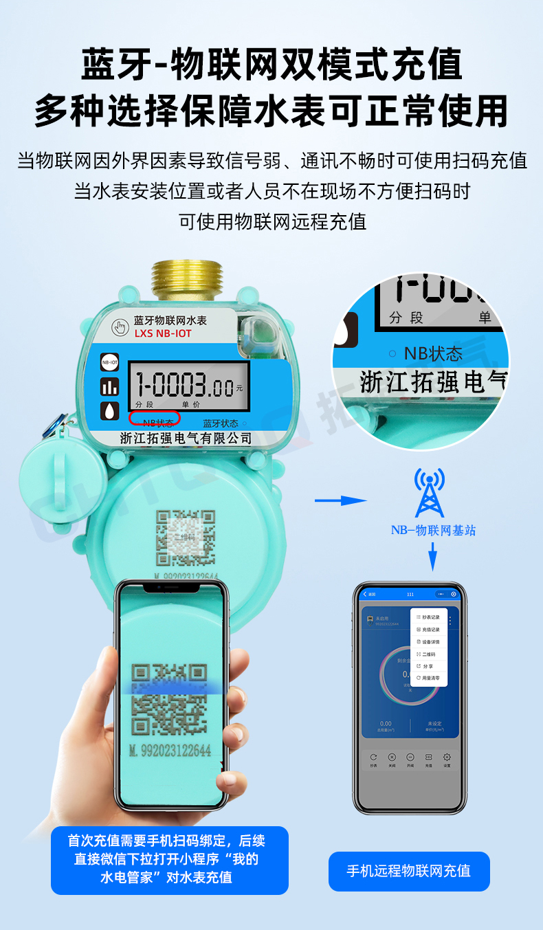 NB-IoT/4G物聯網無線遠傳水表是拓強自主研制的一款用于遠程抄表及閥控的智能預付費水表。它通過窄帶物聯網(Narrow Band Internet of Things, NB-IoT)與服務器進行遠程通訊,無需使用采集器或集中器設備,采用一表一流量卡的點到點連接方式,簡化了設備安裝工作,實現了對水表使用量的自動遠程抄表,并有效的避免了管理部門上門抄表的人力工作。該水表具備閥門控制功能,可方便管理部門對水表的用水情況進行控制,使得遠程抄表及控制變的便捷、可靠,在節約人力、物力和財力的同時,有效提高了生產效益。