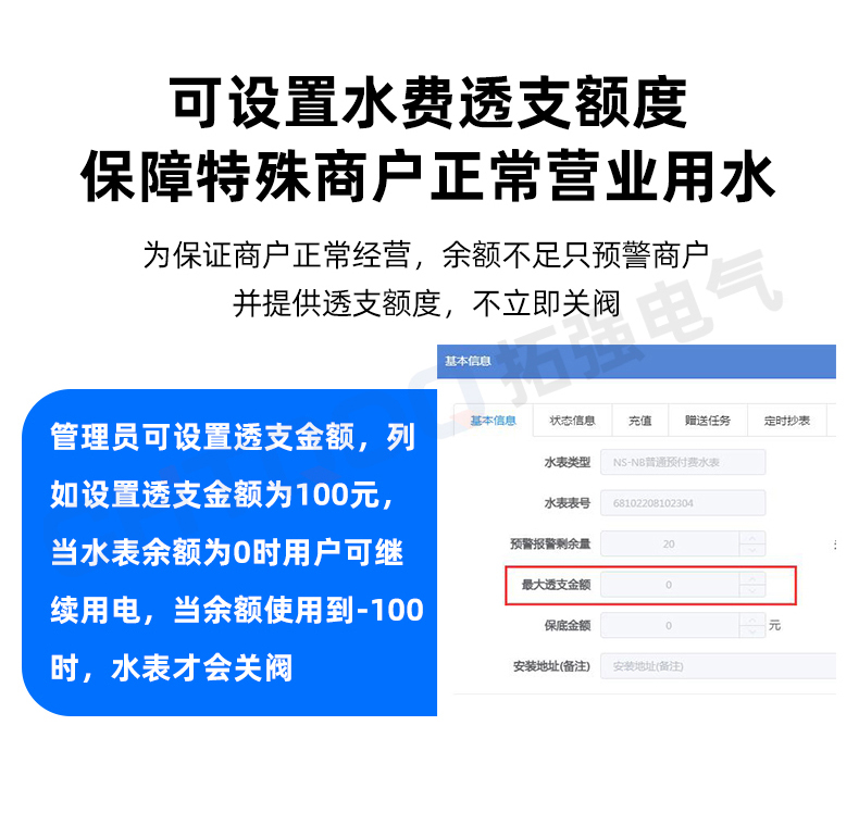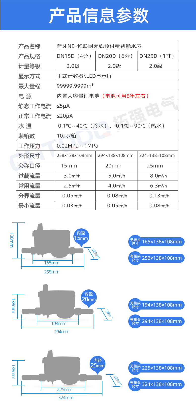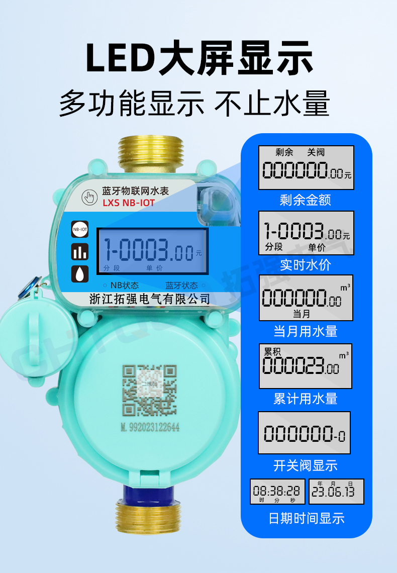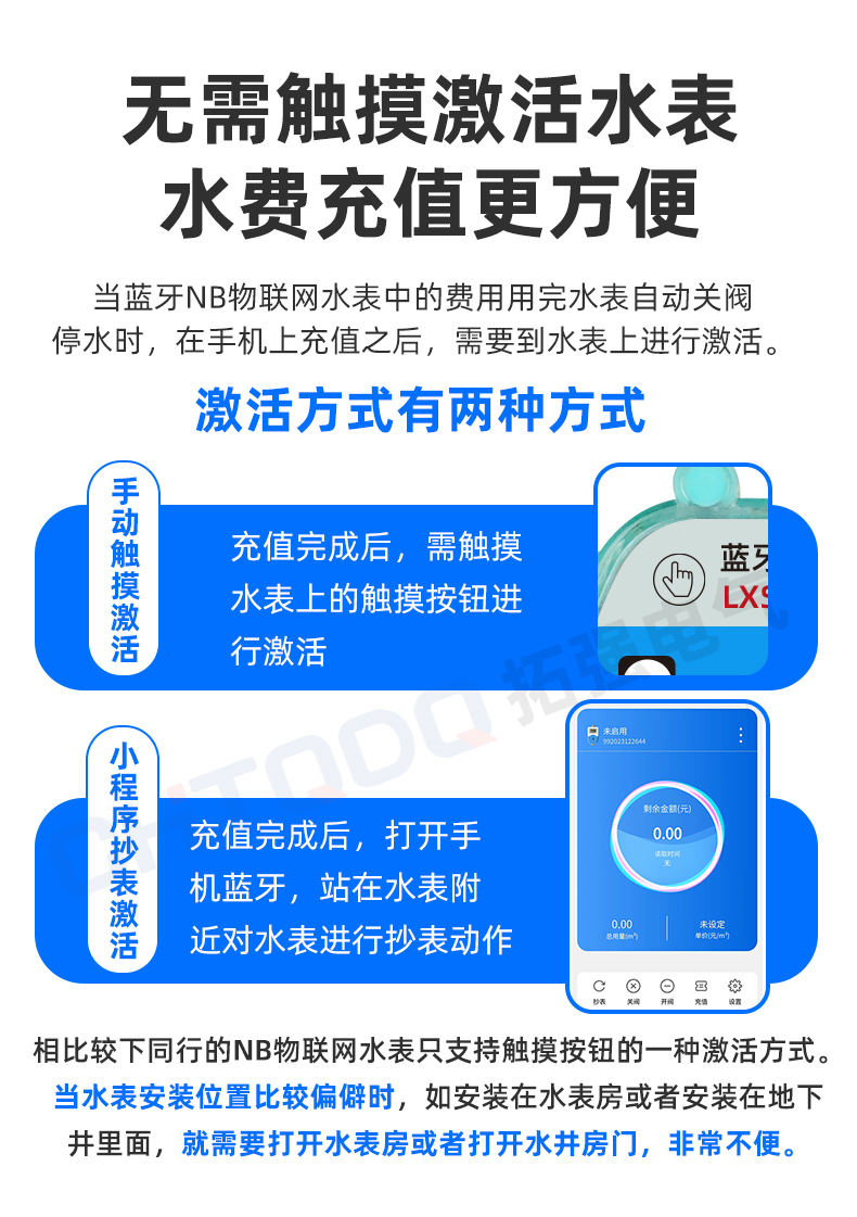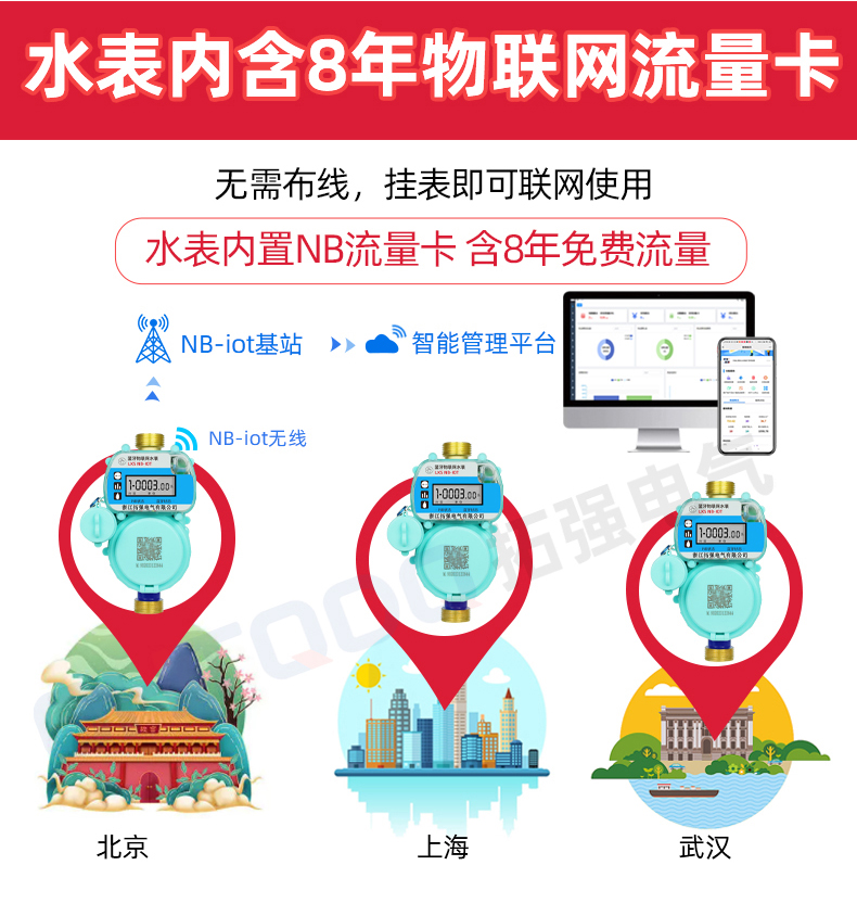NB-IoT/4G物聯網無線遠傳水表是拓強自主研制的一款用于遠程抄表及閥控的智能預付費水表。它通過窄帶物聯網(Narrow Band Internet of Things, NB-IoT)與服務器進行遠程通訊,無需使用采集器或集中器設備,采用一表一流量卡的點到點連接方式,簡化了設備安裝工作,實現了對水表使用量的自動遠程抄表,并有效的避免了管理部門上門抄表的人力工作。該水表具備閥門控制功能,可方便管理部門對水表的用水情況進行控制,使得遠程抄表及控制變的便捷、可靠,在節約人力、物力和財力的同時,有效提高了生產效益。