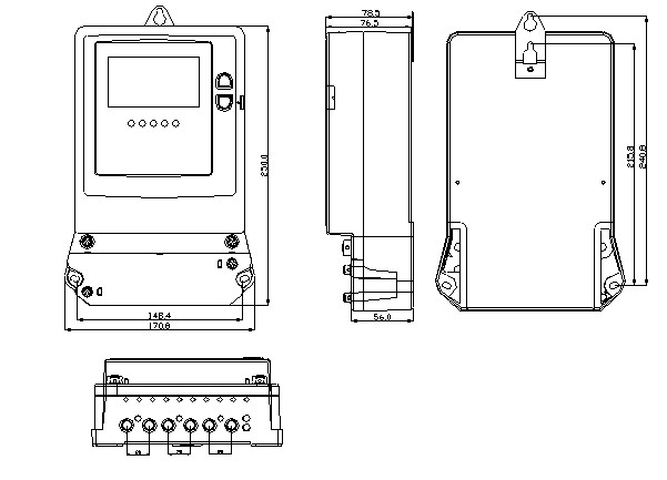 2.3.2電能表安裝在室內(nèi)通風(fēng)干燥的地方,用三個螺釘固定,按下圖3所示的安裝尺寸在底板上先鉆好孔,底座應(yīng)固定在堅固、耐火、不易震動的物體上,確保安裝使用安全、可靠,在有污穢或可能損壞電表的場所,電能表應(yīng)用保護(hù)柜保護(hù)。